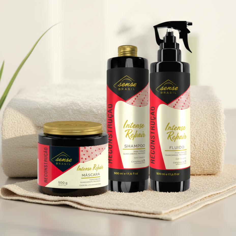 Shampoo 500ml, Máscara 500g e Fluído 500ml.